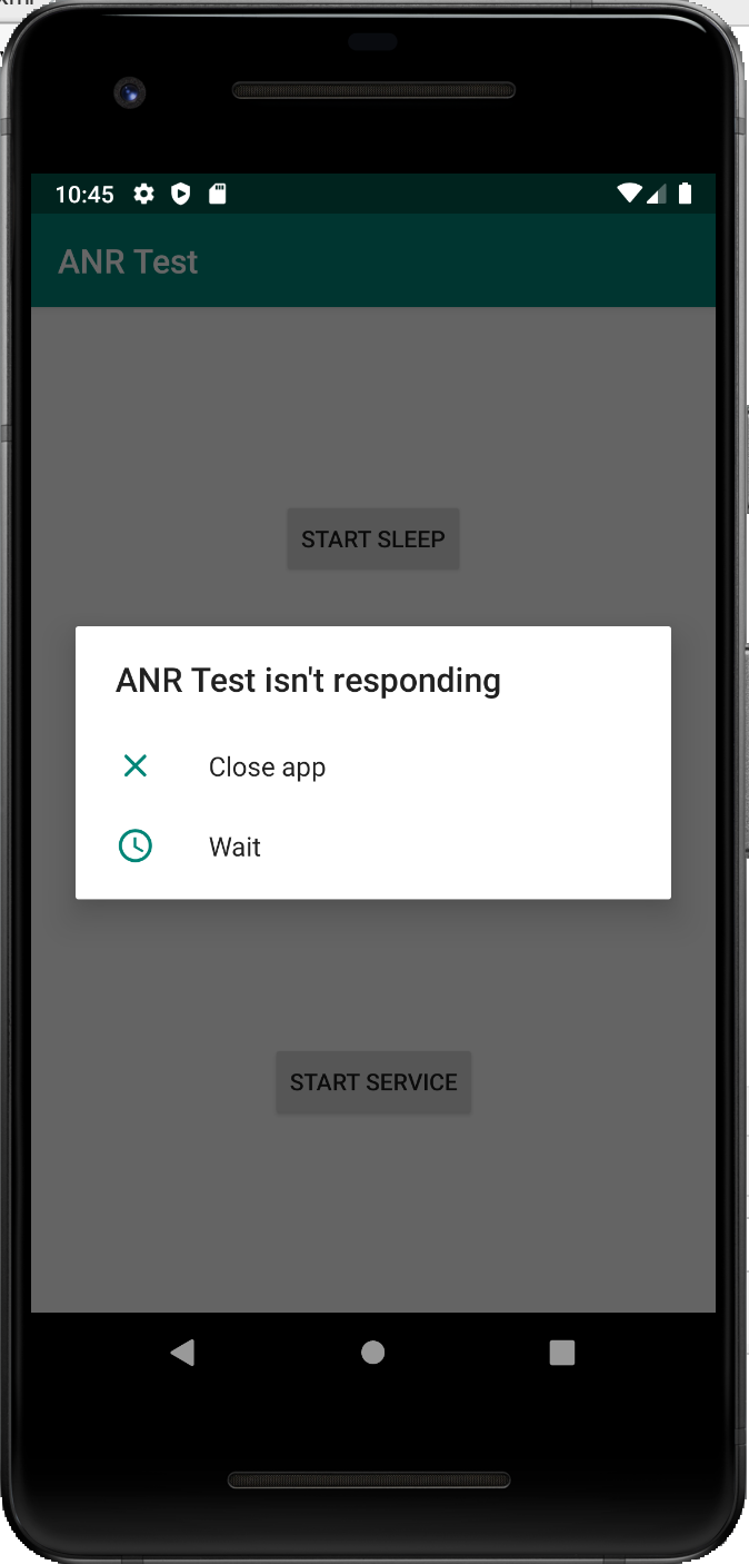 을 통해 10초 동안 메인 스레드가 정지하여 사용자의 첫 번째 이후 버튼을 누른 것을 대기하고 있게 됩니다. 5초 이상 대기하고 있으면 애플리케이션은 ANR이 발생합니다.