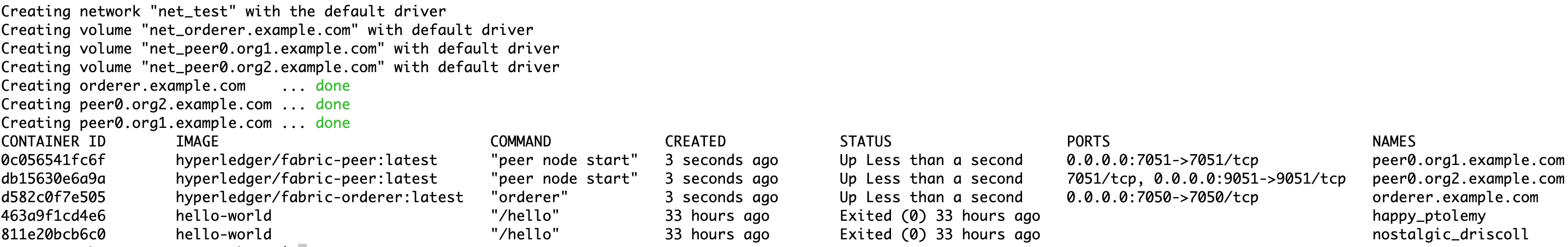 그렇다면 우선 기본적으로 설정되어 있는 1개의 orderer 노드와 2개의 peer 노드를 아래의 명령어를 통해 만들어 봅시다. 정상적으로 실행되었다면 docker container 3개가 실행되는 것을 보실 수 있습니다. docker ps -a를 통해서도 확인 가능합니다.